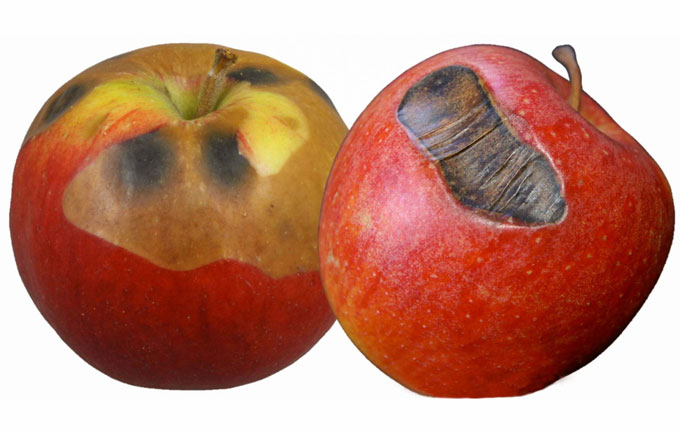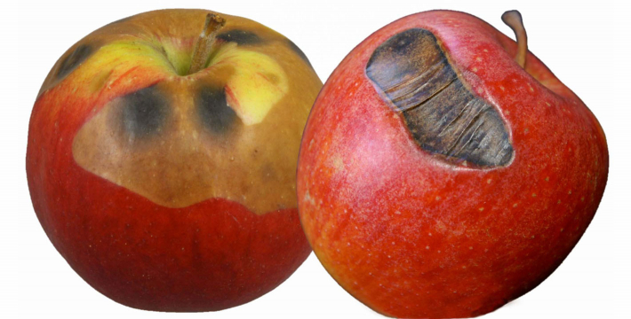 Quizfrage: Sie öffnen im Frühjahr Ihr Obstlager und finden in den Großkisten vermehrt in den obersten Schichten folgende Schäden auf der Apfeloberfläche (s. Fotos 1a–c).